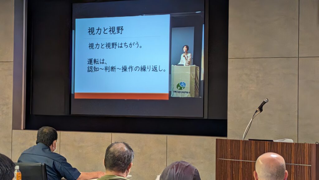 休憩を挟み、第2部は関東自動車交通共済 布施谷 賢司 氏による視野障害対策と題し、人間は年齢に関係なく目(瞳)に1カ所見えなくなる所が有り、左右別の個所なので視界が保たれているが、年齢と共に見えない個所が増えると言う。