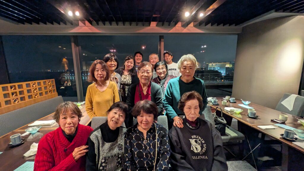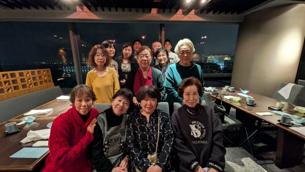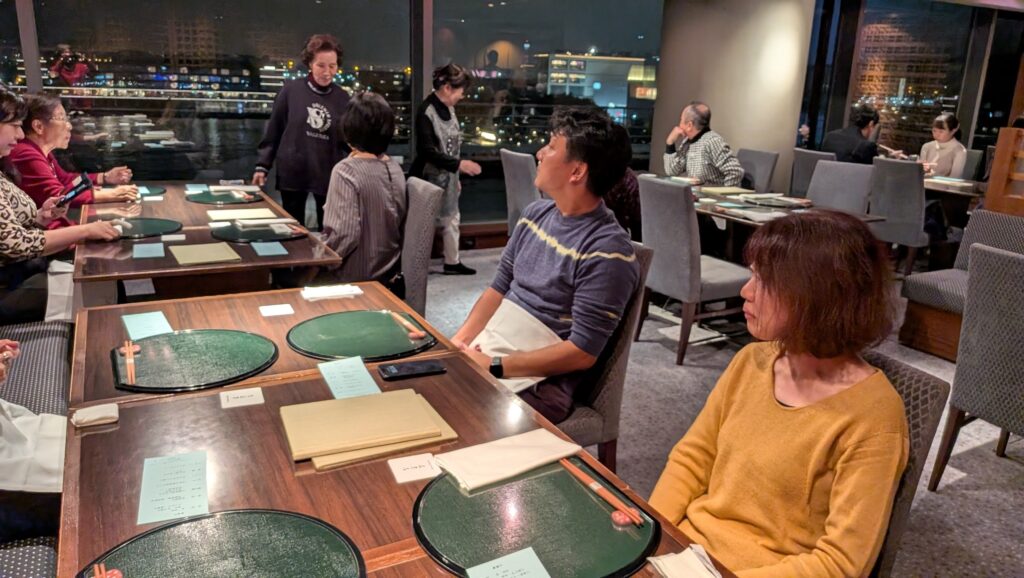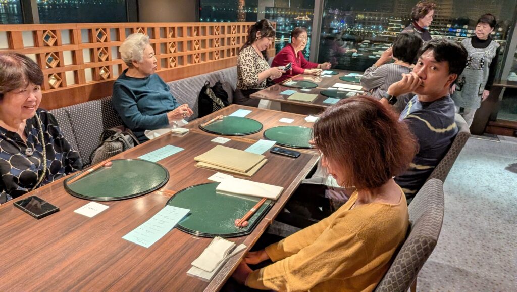 目の前の横浜港を眺めながら懇親会からの参加者と合流し、美味な和食と美酒そして素晴らしい夜景に身も心も心地よく、梶理事による三本締めにて閉会としました。
