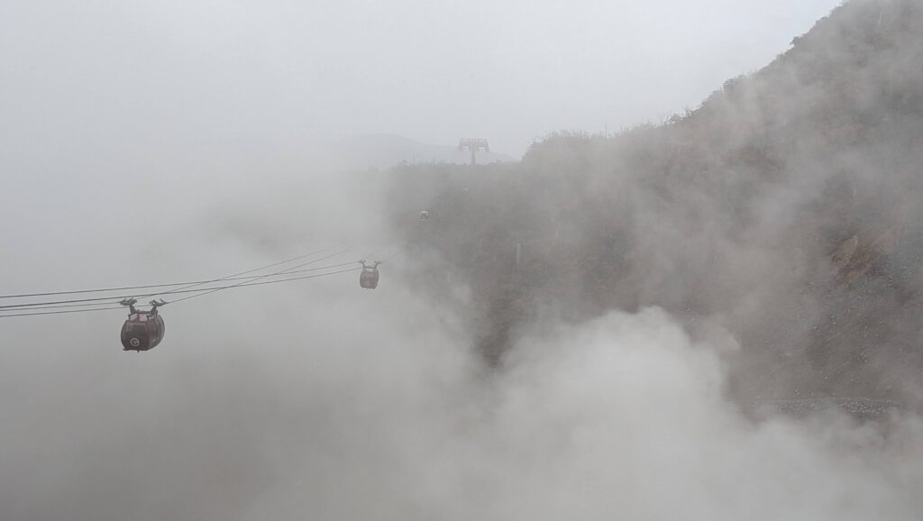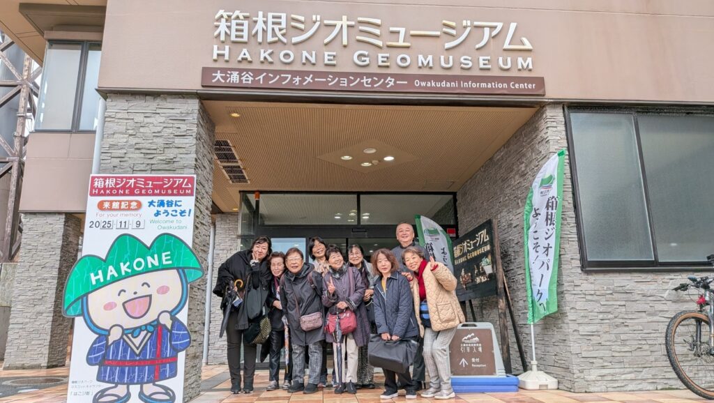 そこから一車線の上り坂を紅葉見物しながら進み、箱根火山資料館として新設された「箱根ジオミュージアム」富士の噴火と戦ってきた記録、温泉を供給、管理の模様、等をじっくり見学し、名物「黒卵」等食したりしながら昼食をとりました。