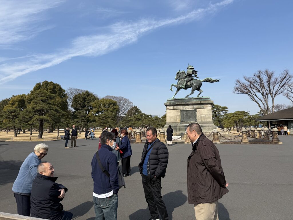 バスガイドにマイクを渡し、バスは第一目的地「皇居前広場」に向かいました。皇居に着くと、観光客が少なく皇居に沿ってランニングをする方と数える程で、外国からの方と我々くらいで、売店でもゆっくり品定めが出来るくらいでした。